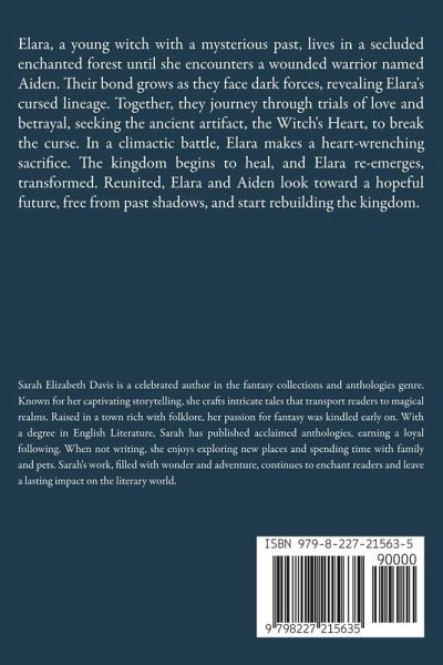 Elara, a young witch with a mysterious past, lives in a secluded enchanted forest until she encounters a wounded warrior named Aiden. Their bond grows as they face dark forces, revealing Elara's cursed lineage. Together, they journey through trials of love and betrayal, seeking the ancient artifact, the Witch's Heart, to break the curse. In a climactic battle, Elara makes a heart-wrenching sacrifice. The kingdom begins to heal, and Elara re-emerges, transformed. Reunited, Elara and Aiden look toward a hopeful future, free from past shadows, and start rebuilding the kingdom.