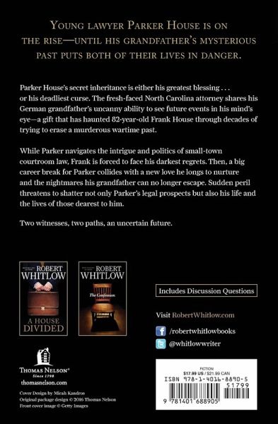 Young lawyer Parker House is on the rise--until his grandfather's mysterious past puts both of their lives in danger. Parker House's secret inheritance is either his greatest blessing . . . or his deadliest curse. The fresh-faced North Carolina attorney shares his German grandfather's uncanny ability to see future events in his mind's eye--a gift that has haunted 82-year-old Frank House through decades of trying to erase a murderous wartime past. While Parker navigates the intrigue and politics of small-town courtroom law, Frank is forced to face his darkest regrets. Then, a big career break for Parker collides with a new love he longs to nurture and the nightmares his grandfather can no longer escape. Sudden peril threatens to shatter not only Parker's legal prospects but also his life and the lives of those dearest to him. Two witnesses, two paths, an uncertain future.