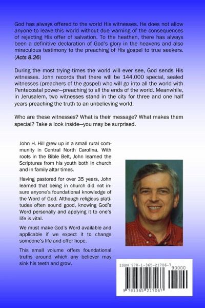 God has always offered to the world His witnesses. He does not allow anyone to leave this world without due warning of the consequences of rejecting His offer of salvation. To the heathen, there has always been a definitive declaration of God's glory in the heavens and also miraculous testimony to the preaching of His gospel to true seekers. (Acts 8.26) During the most trying times the world will ever see, God sends His witnesses. John records that there will be 144,000 special, sealed witnesses (preachers of the gospel) who will go into all the world with Pentecostal power-preaching to all the ends of the world. Meanwhile, in Jerusalem, two witnesses stand in the city for three and one half years preaching the truth to an unbelieving world. Who are these witnesses? What is their message? What makes them special? Take a look inside-you may be surprised.