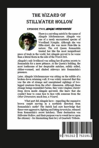 There is a sniveling snitch by the name of Alingale Mitchenmouse. Alingale was one of a rarely encountered species of Woodland Nymphs. Although she was Elfin size, she was more Pixie-like in nature. The Evil Queen Remandala treated her like the most insignificant piece of trash in the world, but Alingale proved to be worse than a literal thorn in the side of the Weevil Itch. Alingale's only Livelihood was selling her ill-begotten secrets to Remandala for a mere pittance. At the Queen's bidding, the most loathsome of her snitches sulkily sidled, slither-wormed, and slinked sidewise into Remandala's presence. Later, Alingale Mitchenmouse was sitting on the rubble of a broken-down retaining wall. It was widely rumored that this was the site of strange and unexplained sightings of two-legged creatures from the other-dimension. Although these strange beings resembled Fairies, they were wingless Giants! She knew that she couldn't bear to come face to face with someone from the Other Dimension; much less, a Wizard. What part did Alingale have - regarding the expansive, brown carpet moving in a northerly direction from Remandala's Castle? The snitch had sure knowledge that these were aggressive, fighting and biting tarantulas, released from Remandala's secret hatchery. Their destination was Stillwater Hollow, and their purpose was to wreak havoc upon the citizenry - for diminishing their levy of quarterly tribute.