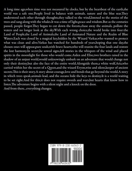 A long time ago,when time was not measured by clocks, but by the heartbeat of the earth,the world was a safe one.People lived in balance with animals, nature and the blue seas.They understood each other through thoughts,they talked to the wind,listened to the stories of the trees and sang along with the whales.It was a time of light,peace and wisdom.But as the centuries passed, people forgot.They began to cut down the forests,chase away the animals, pollute the waters and no longer look at the sky.With each wrong choice,the world broke into four:the Land of People,the Land of Animals,the Land of Animated Nature and the Realm of Blue Waters.Each was closed by a magical key,hidden by the Wizard Varkas,who wanted to protect what was clean and alive.Varkas has watched for hundreds of years,hoping that one day,the chosen ones will appear,pure souls,with brave hearts,who will reunite the four lands and restore the lost harmony.In secret,he sowed signs,left stories in the whispers of the wind and placed spirits in the moonlight for those who would come.Aiden and Elise,two brothers raised in the shadow of an unjust world,would unknowingly embark on an adventure that would change not only their destiny,but also the face of the entire world.Alongside them,a white wolf,Aria,who carried within her the secret of a Queen,and the wizard Eryon,wise and silent,keeper of ancient secrets.This is their story.A story about courage,love and bonds that go beyond the world.A story in which trees speak,animals lead, and the oceans hide the keys to destiny.It is a world waiting to be set right.And for this,it does not require swords and wars,but hearts that know how to listen.The adventure begins with a silent night and a knock on the door. And from there...everything changes.