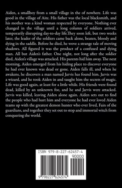 Aiden, a smallboy from a small village in the of nowhere. Life was good in the village of Aite. His father was the local blacksmith, and his mother was a kind woman respected by everyone. Nothing ever changed in the village until a long column of soldiers arrived, temporarily disrupting day-to-day life.They soon left, but two weeks later, the leader of the soldiers came back alone, beaten, bloody and dying in the saddle. Before he died, he wove a strange tale of moving shadows. All figured it was the product of a confused and dying man. All but Aiden's father. One night, not long after the soldier died, Aiden's village was attacked. His parents hid him away. The next morning, Aiden emerged from his hiding place to discover everyone he had ever known was dead or gone. Aiden falls ill, and when he awakens, he discovers a man named Jarvis has found him. Jarvis was a wizard, and he took Aiden in and taught him the secrets of magic. Life was good again, at least for a little while. His friends were found dead, killed by an unknown foe, and he and Jarvis were attacked. Jarvis was killed, leaving Aiden alone again. Aiden sets out to find the people who had hurt him and everyone he had ever loved Aiden teams up with the greatest demon hunter who ever lived, Fain of the guardians, and together they set out to stop and immortal witch from conquering the world.