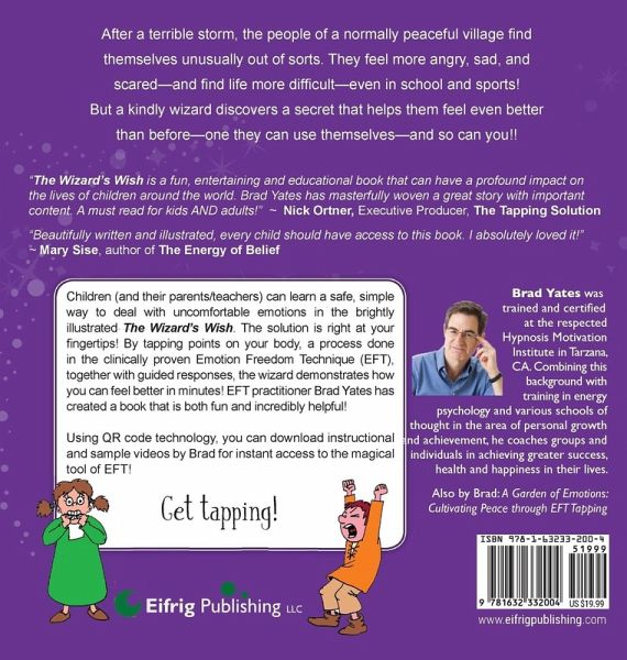 After a terrible storm, the people of a normally peaceful village find themselves unusually out of sorts. They feel more angry, sad, and scared—and find life more difficult—even in school and sports! But a kindly wizard discovers a secret that helps them feel even better than before—one they can use themselves—and so can you!! Children (and their parents/teachers) can learn a safe, simple way to deal with uncomfortable emotions in the brightly illustrated The Wizard’s Wish. The solution is right at your fingertips! By tapping points on your body, a process done in the clinically proven Emotion Freedom Technique (EFT), together with guided responses, the wizard demonstrates how you can feel better in minutes! EFT practitioner Brad Yates has created a book that is both fun and incredibly helpful! Using QR code technology, you can download instructional and sample videos by Brad for instant access to the magical tool of EFT! "The Wizard’s Wish is a fun, entertaining and educational book that can have a profound impact on the lives of children around the world. Brad Yates has masterfully woven a great story with important content. A must read for kids AND adults!" ~ Nick Ortner, Executive Producer, The Tapping Solution "Beautifully written and illustrated, every child should have access to this book. I absolutely loved it!" ~ Mary Sise, author of The Energy of Belief Brad Yates was trained and certified at the respected Hypnosis Motivation Institute in Tarzana, CA. Combining this background with training in energy psychology and various schools of thought in the area of personal growth and achievement, he coaches groups and individuals in achieving greater success, health and happiness in their lives. Also by Brad: A Garden of Emotions: Cultivating Peace through EFT Tapping, which includes 10 downloadable videos that help kids get through specific difficult emotional situations. published by eifrig publishing, www.eifrigpublishing.com
