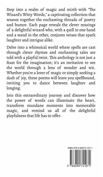Step into a realm of magic and mirth with "The Wizard's Witty Words," a captivating collection that weaves together the enchanting threads of poetry and humor. Each page reveals the clever musings of a delightful wizard who, with a quill in one hand and a wand in the other, conjures verses that spark laughter and intrigue alike. Delve into a whimsical world where spells are cast through clever rhymes and enchanting tales are told with a playful twist. This anthology is not just a feast for the imagination; it's an invitation to see the world through a lens of wonder and wit. Whether you're a lover of magic or simply seeking a dash of joy, these poems will leave you spellbound, inviting you to dance between laughter and longing. Join this extraordinary journey and discover how the power of words can illuminate the heart, transform mundane moments into memorable magic, and remind us all of the delightful playfulness that life has to offer.