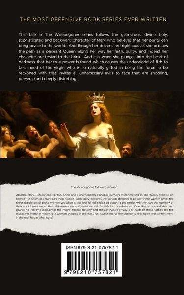 This tale in The Woebegones series follows the glamorous, divine, holy, sophisticated and backward character of Mary who believes that her purity can bring peace to the world. And though her dreams are righteous as she pursues the path as a pageant Queen, along her way her faith, purity, and indeed her character are tested to the brink. And it is when she plunges into the heart of darkness that her true power is found which causes the underworld of filth to take heed of the virgin who is so naturally gifted in being the force to be reckoned with that invites all unnecessary evils to face that are shocking, perverse and deeply disturbing.
