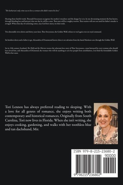 "The barbarian's only crime was to love a woman who didn't return his love." Hearing those fateful words, Thorauld Sweynsson recognizes his mother's treachery and the danger he is in. In one devastating moment the boy knows, through blinding loss and betrayal, that one day he will be a man. That man will be a mighty warrior. That warrior will not rest until his father's murder is avenged. When that day of reckoning comes, may God have mercy on their souls. Two detestable wives down and thirty years later, Thor Sweynsson, the Golden Wolf, refuses to wed again even on royal command. Six brothers down and a father to go, Alexandria of Drummond knows there is no salvation from the hated Maclaren save through the Golden Wolf. Set in 12th century Scotland, The Wolf and the Warrior weaves the reluctant love story of Thor Sweynsson, a man betrayed by every woman who should have loved him, and Alexandria of Drumond, the woman who will do anything to save her people from annihilation, even bind the formidable Golden Wolf to her cause.