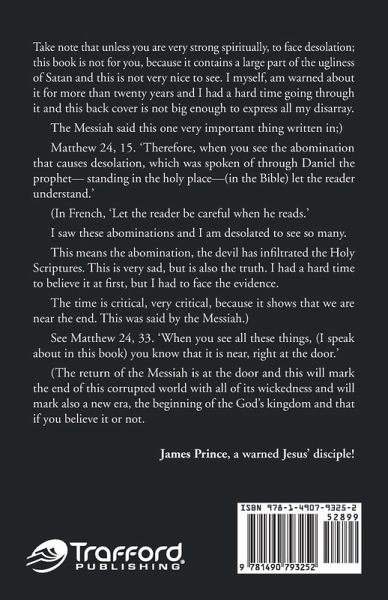 Take note that unless you are very strong spiritually, to face desolation; this book is not for you, because it contains a large part of the ugliness of Satan and this is not very nice to see. I myself, am warned about it for more than twenty years and I had a hard time going through it and this back cover is not big enough to express all my disarray. The Messiah said this one very important thing written in;) Matthew 24, 15. 'Therefore, when you see the abomination that causes desolation, which was spoken of through Daniel the prophet- standing in the holy place-(in the Bible) let the reader understand.' (In French, 'Let the reader be careful when he reads.' I saw these abominations and I am desolated to see so many. This means the abomination, the devil has infiltrated the Holy Scriptures. This is very sad, but is also the truth. I had a hard time to believe it at first, but I had to face the evidence. The time is critical, very critical, because it shows that we are near the end. This was said by the Messiah.) See Matthew 24, 33. 'When you see all these things, (I speak about in this book) you know that it is near, right at the door.' (The return of the Messiah is at the door and this will mark the end of this corrupted world with all of its wickedness and will mark also a new era, the beginning of the God's kingdom and that if you believe it or not. James Prince, a warned Jesus' disciple!