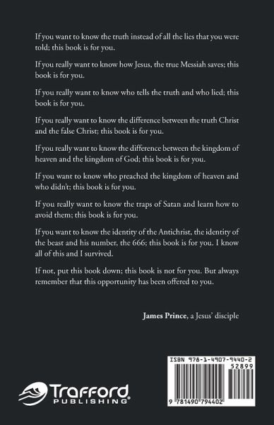 If you want to know the truth instead of all the lies that you were told; this book is for you. If you really want to know how Jesus, the true Messiah saves; this book is for you. If you really want to know who tells the truth and who lied; this book is for you. If you really want to know the difference between the truth Christ and the false Christ; this book is for you. If you really want to know the difference between the kingdom of heaven and the kingdom of God; this book is for you. If you want to know who preached the kingdom of heaven and who didn't; this book is for you. If you really want to know the traps of Satan and learn how to avoid them; this book is for you. If you want to know the identity of the Antichrist, the identity of the beast and his number, the 666; this book is for you. I know all of this and I survived. If not, put this book down; this book is not for you. But always remember that this opportunity has been offered to you. James Prince, a Jesus' disciple