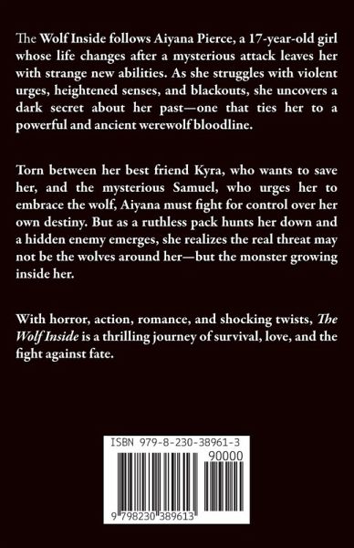 The Wolf Inside follows Aiyana Pierce, a 17-year-old girl whose life changes after a mysterious attack leaves her with strange new abilities. As she struggles with violent urges, heightened senses, and blackouts, she uncovers a dark secret about her past-one that ties her to a powerful and ancient werewolf bloodline. Torn between her best friend Kyra, who wants to save her, and the mysterious Samuel, who urges her to embrace the wolf, Aiyana must fight for control over her own destiny. But as a ruthless pack hunts her down and a hidden enemy emerges, she realizes the real threat may not be the wolves around her-but the monster growing inside her. With horror, action, romance, and shocking twists, The Wolf Inside is a thrilling journey of survival, love, and the fight against fate.