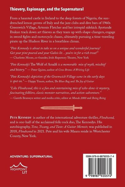 Thievery, Espionage, and the Supernatural A global adventure of thievery and espionage meets the supernatural in Pete Kennedy's latest, The Wolf of Amalfi. Artemis Fletcher and her intrepid sidekick Ayotunde Ibukun hold down day jobs as respectable college professors, but once out of the classroom they pursue their real vocation as international secret agents charged with an almost impossible task. From a haunted castle in Ireland to the deep forests of Nigeria, the sun-drenched lemon groves of Italy and the jazz clubs and dive bars of 1960s Greenwich Village, they track down and do battle with art thieves. Along the way they team up with shape-changers, engage in sword fights and motorcycle chases, ultimately pursuing a time-traveling pirate up the Hudson River in a breathless climax. "Pete Kennedy is about to take us on a unique and wonderful journey! From a pub on Dublin's busy Grafton Street through the windswept ancient castles of an Ireland full of folklore and mystery..... get your pint poured and your Galois lit....you're in for a rich treat!" - Charlotte Moore, co-founder, Irish Repertory Theatre, New York "Pete Kennedy's The Wolf of Amalfi is a memorable mix of myth, mischief and history. Find a comfortable chair, pour a favorite drink, and start reading. Once you begin the first page, there's no putting it down until you finish the last." - Peter Quinn, author of Cross Bronx: A Writing Life "Pete Kennedy's depiction of the Greenwich Village scene in the early days is spot on." - Happy Traum, author, The Blues Bag and The Joy of Guitar "Brace yourself for more globetrotting myth, mysteries, and monsters in Pete Kennedy's follow-up to his page-turning Floodwood. In The Wolf of Amalfi, our beloved protagonist Artemis Fletcher teams up with Yoruba scholar, Ayotunde Ibuken, as they travel the world to fight werewolves, mad Irish professors, reincarnated 18th century pirates, and thieves of sacred African statues. Like Floodwood, this is a fun and entertaining mix of who-done-it mystery, fascinating folklore, classic monster narratives, and action-adventure." - Gareth Branwyn writer and media critic, editor at Mondo 2000 and Boing Boing