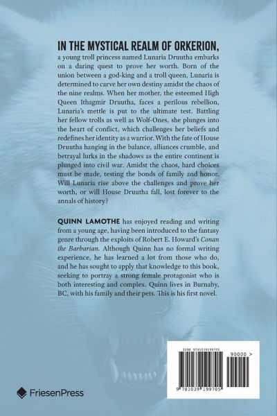 In the mystical realm of Orkerion, a young troll princess named Lunaria Druutha embarks on a daring quest to prove her worth. Born of the union between a god-king and a troll queen, Lunaria is determined to carve her own destiny amidst the chaos of the nine realms. When her mother, the esteemed High Queen Ithagmir Druutha, faces a perilous rebellion, Lunaria's mettle is put to the ultimate test. Battling her fellow trolls as well as Wolf-Ones, she plunges into the heart of conflict, which challenges her beliefs and redefines her identity as a warrior. With the fate of House Druutha hanging in the balance, alliances crumble, and betrayal lurks in the shadows as the entire continent is plunged into civil war. Amidst the chaos, hard choices must be made, testing the bonds of family and honor. Will Lunaria rise above the challenges and prove her worth, or will House Druutha fall, lost forever to the annals of history?