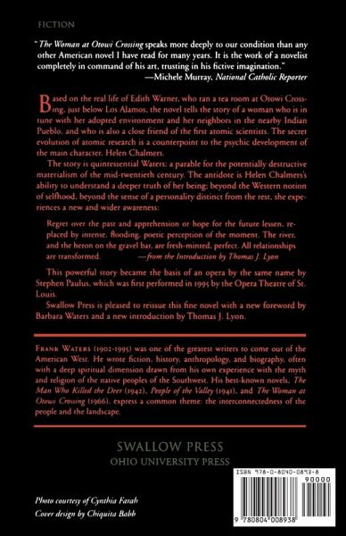 Based on the real life of Edith Warner, who ran a tearoom at Otowi Crossing, just below Los Alamos, The Woman at Otowi Crossing is the story of Helen Chalmer, a person in tune with her adopted environment and her neighbors in the nearby Indian pueblo and also a friend of the first atomic scientists. The secret evolution of atomic research is a counterpoint to her psychic development. In keeping with its tradition of allowing the best of its list to thrive, Ohio University Press/Swallow Press is particularly proud to reissue The Woman at Otowi Crossing by best-selling author Frank Waters. This new edition features an introduction by Professor Thomas J. Lyon and a foreword by the author's widow, Barbara Waters. The story is quintessential Waters: a parable for the potentially destructive materialism of the mid-twentieth century. The antidote is Helen Chalmer's ability to understand a deeper truth of her being; beyond the Western notion of selfhood, beyond the sense of a personality distinct from the rest, she experiences a new and wider awareness. The basis for an opera of the same name, The Woman at Otowi Crossing is the powerful story of the crossing of cultures and lives: a fable for our times.