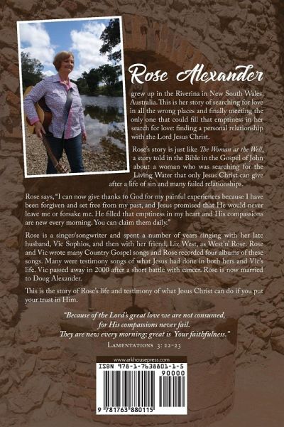 Rose Alexander grew up in the Riverina in New South Wales, Australia. This is her story of searching for love in all the wrong places and finally meeting the only one that could fill that emptiness in her search for love: finding a personal relationship with the Lord Jesus Christ. Rose's story is just like The Woman at the Well, a story told in the Bible in the Gospel of John about a woman who was searching for the Living Water that only Jesus Christ can give after a life of sin and many failed relationships. Rose says, "I can now give thanks to God for my painful experiences because I have been forgiven and set free from my past, and Jesus promised that He would never leave me or forsake me. He filled that emptiness in my heart and His compassions are new every morning. You can claim them daily." Rose is a singer/songwriter and spent a number of years singing with her late husband, Vic Sophios, and then with her friend, Liz West, as West'n' Rose. Rose and Vic wrote many Country Gospel songs and Rose recorded four albums of these songs. Many were testimony songs of what Jesus had done in both hers and Vic's life. Vic passed away in 2000 after a short battle with cancer. Rose is now married to Doug Alexander. This is the story of Rose's life and testimony of what Jesus Christ can do if you put your trust in Him."Because of the Lord's great love we are not consumed, for His compassions never fail. They are new every morning; great is Your faithfulness." Lamentations 3: 22-23