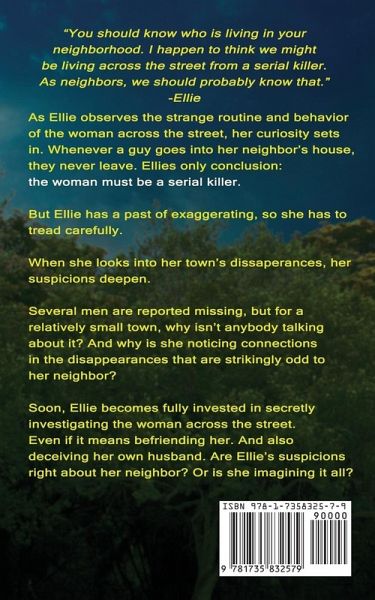 BOOK 1 in the "The Woman" Series. "You should know who is living in your neighborhood. I happen to think we might be living across the street from a serial killer. As neighbors, we should probably know that." - Ellie _____________ As Ellie observes the strange routine and behavior of the woman across the street, her curiosity sets in. Whenever a guy goes into her neighbor's house, they never leave. Ellie's only conclusion: the woman must be a serial killer. But Ellie has a past of exaggerating, so she has to tread carefully. When she looks into her town's disappearances, her suspicions deepen. Several men are reported missing, but for a relatively small town, why isn't anybody talking about it? And why is she noticing connections in the disappearances that are strikingly odd to her neighbor? Soon, Ellie becomes fully invested in secretly investigating the woman across the street. Even if it means befriending her. And also deceiving her own husband. Are Ellie's suspicions right about her neighbor? Or is she imagining it all?