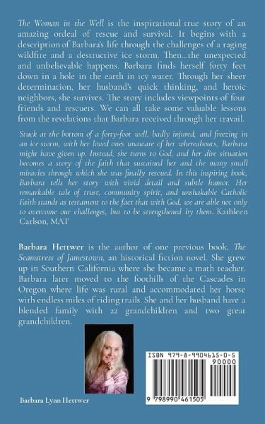 The Woman in the Well is the true, inspirational story of an amazing ordeal of endurance and survival. It begins with a description of Barbara's life through the challenges of a raging wildfire and a destructive ice storm. Then...the unexpected and unbelievable happens. She finds herself forty feet down in a hole in the earth in icy water. Through her sheer determination, her husband's quick thinking, and heroic neighbors, she is rescued and survives. The story includes viewpoints of four friends and rescuers. We can all take some valuable lessons from the revelations that Barbara received through her travail.