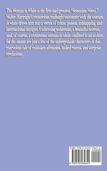The Woman in White is the first and greatest "Sensation Novel." Walter Hartright's mysterious midnight encounter with the woman in white draws him into a vortex of crime, poison, kidnapping, and international intrigue. A scheming nobleman, a beautiful heiress, and, of course, a mysterious woman in white confined to an asylum for the insane are just a few of the unforgettable characters in this marvelous tale of mistaken identities, locked rooms, and surprise revelations.