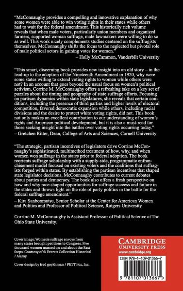 This book departs from familiar accounts of high-profile woman suffrage activists whose main concern was a federal constitutional amendment. It tells the story of woman suffrage as one involving the diverse politics of women across the country as well as the incentives of the men with the primary political authority to grant new voting rights - those in state legislatures. Through a mix of qualitative and quantitative evidence, the book explains the success and failures of efforts for woman suffrage provisions in five states and in the US Congress as the result of successful and failed coalitional politics between the suffrage movement and important constituencies of existing male voters, including farmers' organizations, labor unions, and the Populist and Progressive parties.