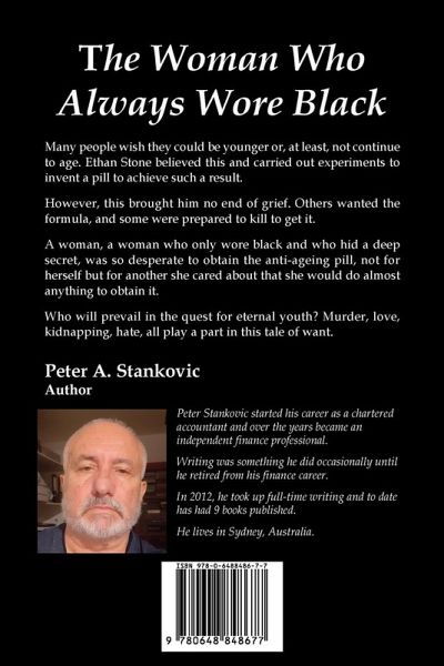 Many people wish they could be younger or, at least, not continue to age. Ethan Stone believed this and carried out experiments to invent a pill to achieve such a result. However, this brought him no end of grief. Others wanted the formula, and some were prepared to kill to get it. A woman, a woman who only wore black and who hid a deep secret, was so desperate to obtain the anti-ageing pill, not for herself but for another she cared about that she would do almost anything to obtain it. Who will prevail in the quest for eternal youth? Murder, love, kidnapping, hate, all play a part in this tale of want.