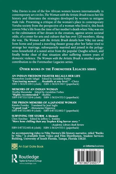 Nike Davies is one of the few African women known internationally in contemporary art circles. The Woman with the Artistic Brush traces her life history and illustrates the strategies developed by women to mitigate male rule. Presenting a critique of the woman's place in contemporary Yoruba society from the perspective of a woman who lived it, this book covers Nike's life from the time of her mother's death when Nike was six to the culmination of her dream in the creation, against severe societal odds, of a center for arts and culture that has over 120 members. Along the way, The Woman with the Artistic Brush details how Nike ran away from home and joined a traveling theater group after her father tried to arrange her marriage, subsequently married and joined in the polygynous household of a noted artist from the popular Osogbo school, and finally broke clear of that situation after suffering sixteen years of domestic violence. The Woman with the Artistic Brush is another superb contribution to the Foremother Legacies series.