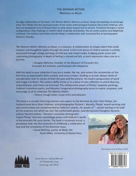 An edgy collaboration of the heart, The Woman Within: Memory as Muse, brings the paintings of Anchorage artist Tami Phelps into the expressive realm of her writer-anthropologist husband, Kerry Dean Feldman, who does not disappoint as he embraces them in verse about respect due to women. Presented daringly in varied configurations, they challenge or confirm ideas of gender and destiny. The art works surprise and delightfully confound. The sections that follow include Phelps's collaboration with renowned fine art photographer Richard J. Murphy.