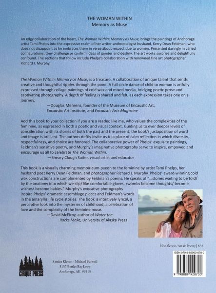 An edgy collaboration of the heart, The Woman Within: Memory as Muse, brings the paintings of Anchorage artist Tami Phelps into the expressive realm of her writer-anthropologist husband, Kerry Dean Feldman, who does not disappoint as he embraces them in verse about respect due to women. Presented daringly in varied configurations, they challenge or confirm ideas of gender and destiny. The art works surprise and delightfully confound. The sections that follow include Phelps's collaboration with renowned fine art photographer Richard J. Murphy.