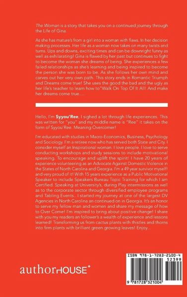 The Woman is a story that takes you on a continued journey through the Life of Gina. As she has matured from a girl into a woman with flaws. In her decision making processes. Her life as a woman now takes on many twists and turns. Ups and downs, exciting times and can be downright funny as well as exhilarating! Gina is flawed by her past but continues to fight to become the woman she dreams of being. She experiences a few failed relationships as she's learning and being inspired to become the person she was born to be, not trained to be! As she follows her own mind and carves out her very own path. This story ends in Romantic Triumph and Dreams come true! She uses the good the bad and the ugly as her life's teacher to learn how to"Walk On Top Of It All! And make her dreams come true.....
