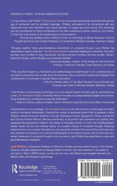 "Long overdue, Layli Phillips' The Womanist Reader is a pioneering text that illuminates the genealogy of womanism and its complex meanings. Phillips' articulation of its connections with and departures from both 'feminism' and 'black feminism' is cogent and provocative. This anthology lays the groundwork for future scholarship on this little understood analytic construct, but critically important intervention in the broad project of social justice."