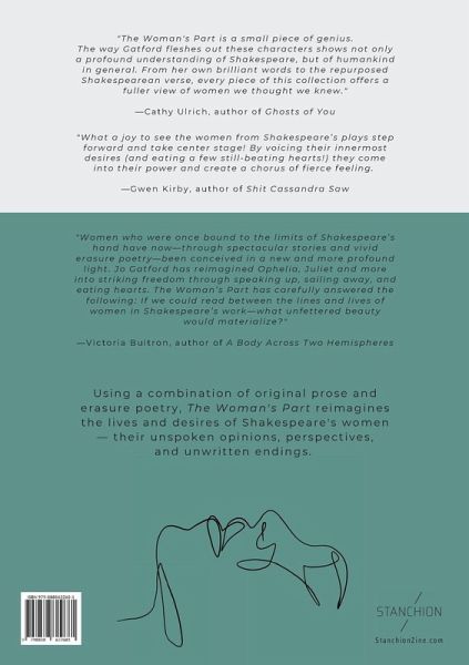 Using a combination of original prose and erasure poetry, The Woman's Part reimagines the lives and desires of Shakespeare's women - their unspoken opinions, perspectives, and unwritten endings. Each piece is accompanied by an erasure poem made from one of the character's speeches. Gatford says of her chapbook, "My aim with this collection was not necessarily to make a grand statement, but to explore the thoughts and experiences of women who were never given the stage time to say what they really thought, or the ending they deserved. Which is probably all any of us really want."