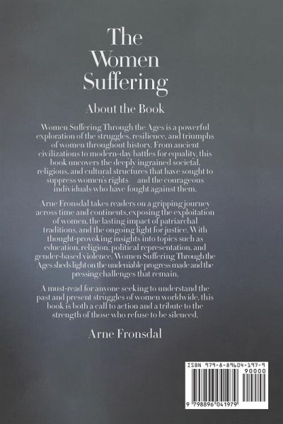The Women Suffering Through the Ages By Arne Fronsdal A siren screams. Missiles fall. A mother hides her child beneath the floorboards. Somewhere else, a young doctor performs surgery in the dark with trembling hands-and no anaesthetic. In The Women Suffering Through the Ages, Arne Fronsdal unveils a raw, unflinching chronicle of survival, injustice, and resilience-from the brutal invasion of Ukraine to the systematic subjugation of women across continents and centuries. Woven from first-hand accounts, historical reflections, and deeply human stories, this book does not look away. It demands that we see. Set against the backdrop of modern warfare and ancient patriarchy, the narrative travels from the bombed hospitals of Mariupol to tribal jungles of Ecuador, from the soul-crushing grip of organised religion to the quiet power of mothers, nurses, and young girls who refuse to break. At its heart is a plea: to witness the truth, and to confront what generations have been taught to accept. This is not just a book about war. It is not only about women. It is about the brutal cost of power, and the quiet defiance of those the world tried to forget. Told in the voice of a witness who has lived, listened, and refused to be silent, The Women Suffering Through the Ages is as urgent as it is unforgettable. You will emerge changed.