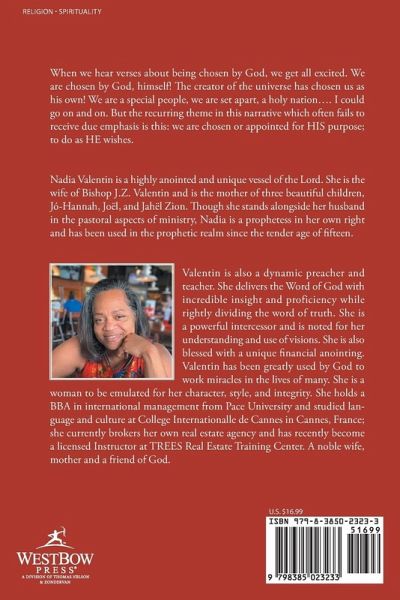 When we hear verses about being chosen by God, we get all excited. We are chosen by God, himself! The creator of the universe has chosen us as his own! We are a special people, we are set apart, a holy nation.... I could go on and on. But the recurring theme in this narrative which often fails to receive due emphasis is this: we are chosen or appointed for HIS purpose; to do as HE wishes. Nadia Valentin is a highly anointed and unique vessel of the Lord. She is the wife of Bishop J.Z. Valentin and is the mother of three beautiful children, Jó-Hannah, Joël, and Jahël Zion. Though she stands alongside her husband in the pastoral aspects of ministry, Nadia is a prophetess in her own right and has been used in the prophetic realm since the tender age of fifteen. When we hear verses about being chosen by God, we get all excited. We are chosen by God, himself! The creator of the universe has chosen us as his own! We are a special people, we are set apart, a holy nation.... I could go on and on. But the recurring theme in this narrative which often fails to receive due emphasis is this: we are chosen or appointed for HIS purpose; to do as HE wishes. Nadia Valentin is a highly anointed and unique vessel of the Lord. She is the wife of Bishop J.Z. Valentin and is the mother of three beautiful children, Jó-Hannah, Joël, and Jahël Zion. Though she stands alongside her husband in the pastoral aspects of ministry, Nadia is a prophetess in her own right and has been used in the prophetic realm since the tender age of fifteen.