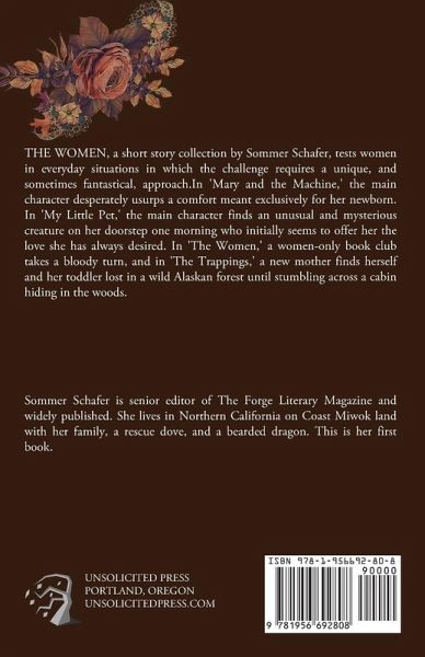 THE WOMEN, a short story collection by Sommer Schafer, tests women in everyday situations in which the challenge requires a unique, and sometimes fantastical, approach.In 'Mary and the Machine,' the main character desperately usurps a comfort meant exclusively for her newborn. In 'My Little Pet,' the main character finds an unusual and mysterious creature on her doorstep one morning who initially seems to offer her the love she has always desired. In 'The Women,' a women-only book club takes a bloody turn, and in 'The Trappings,' a new mother finds herself and her toddler lost in a wild Alaskan forest until stumbling across a cabin hiding in the woods.