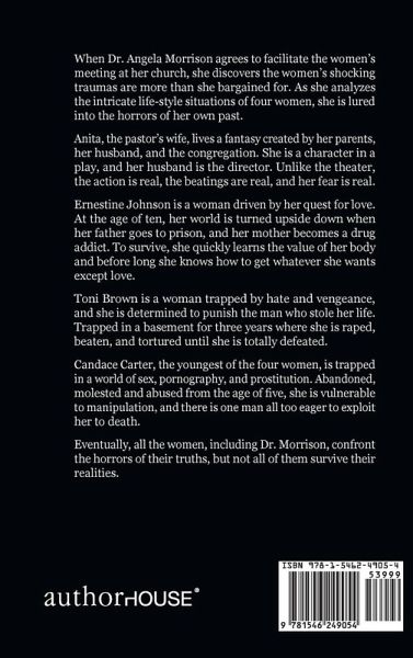 When Dr. Angela Morrison agrees to facilitate the women's meeting at her church, she discovers the women's shocking traumas are more than she bargained for. As she analyzes the intricate life-style situations of four women, she is lured into the horrors of her own past. Anita, the pastor's wife, lives a fantasy created by her parents, her husband, and the congregation. She is a character in a play, and her husband is the director. Unlike the theater, the action is real, the beatings are real, and her fear is real. Ernestine Johnson is a woman driven by her quest for love. At the age of ten, her world is turned upside down when her father goes to prison, and her mother becomes a drug addict. To survive, she quickly learns the value of her body and before long she knows how to get whatever she wants except love. Toni Brown is a woman trapped by hate and vengeance, and she is determined to punish the man who stole her life. Trapped in a basement for three years where she is raped, beaten, and tortured until she is totally defeated. Candace Carter, the youngest of the four women, is trapped in a world of sex, pornography, and prostitution. Abandoned, molested and abused from the age of five, she is vulnerable to manipulation, and there is one man all too eager to exploit her to death. Eventually, all the women, including Dr. Morrison, confront the horrors of their truths, but not all of them survive their realities.