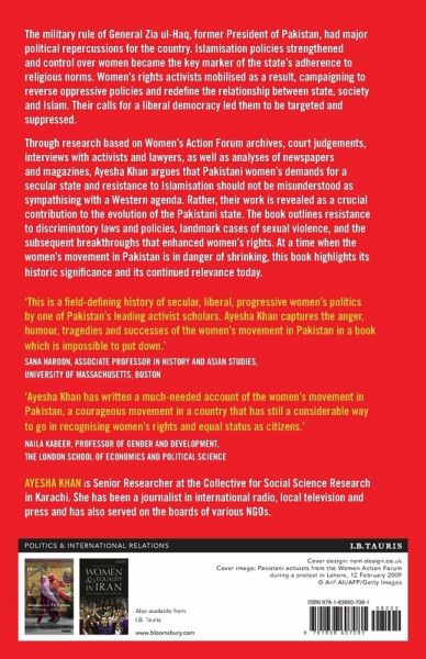 The military rule of General Zia ul-Haq, former President of Pakistan, had significant political repercussions for the country. Islamization policies were far more pronounced and control over women became the key marker of the state's adherence to religious norms. Women's rights activists mobilized as a result, campaigning to reverse oppressive policies and redefine the relationship between state, society and Islam. Their calls for a liberal democracy led them to be targeted and suppressed. This book is a history of the modern women's movement in Pakistan. The research is based on documents from the Women's Action Forum archives, court judgments on relevant cases, as well as interviews with activists, lawyers and judges and analysis of newspapers and magazines. Ayesha Khan argues that the demand for a secular state and resistance to Islamization should not be misunderstood as Pakistani women sympathizing with a western agenda. Rather, their work is a crucial contribution to the evolution of the Pakistani state. The book outlines the discriminatory laws and policies that triggered domestic and international outcry, landmark cases of sexual violence that rallied women activists together and the important breakthroughs that enhanced women's rights. At a time when the women's movement in Pakistan is in danger of shrinking, this book highlights its historic significance and its continued relevance today.