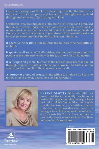 Hear the messages of the Lord's teaching into the the life of His follower: of His love, peace and harmony of thought she received throughout her years of journaling with Him. She began to receive messages of the truth of His ways and promised the Lord to reveal those truths to all people of the world, as He requested of her, so that they would come to know Him, understand God's wisdom, knowledge, and promises of His heartfelt desire to have them enter into the Kingdom of Heaven with Him. It opens to the hearts: of the faithful and to those who hold little or no faith. It speaks to all souls: of God's wishes, desires, and hopes upon His people of the universe to know of His great love for all humanity. It calls upon all people: to come to the Lord in their heart and mind through prayer, for faith and hope, to follow in His truths, and to open your heart to Him. He who awaits your call. A journey of profound beauty: in the telling to all those God calls to follow Him in prayer, peace, love, and forgiveness.