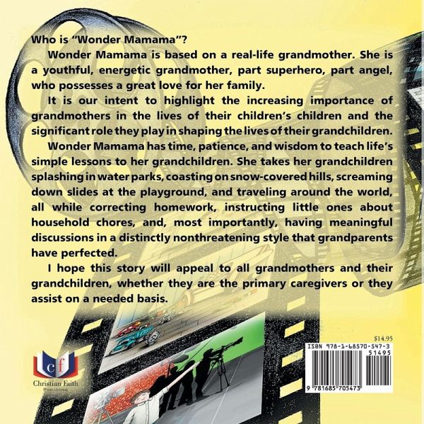 Who is "Wonder Mamama"? Wonder Mamama is based on a real-life grandmother. She is a youthful, energetic grandmother, part superhero, part angel, who possesses a great love for her family. It is our intent to highlight the increasing importance of grandmothers in the lives of their children's children and the significant role they play in shaping the lives of their grandchildren. Wonder Mamama has time, patience, and wisdom to teach life's simple lessons to her grandchildren. She takes her grandchildren splashing in water parks, coasting on snow-covered hills, screaming down slides at the playground, and traveling around the world, all while correcting homework, instructing little ones about household chores, and, most importantly, having meaningful discussions in a distinctly nonthreatening style that grandparents have perfected. I hope this story will appeal to all grandmothers and their grandchildren, whether they are the primary caregivers or they assist on a needed basis.