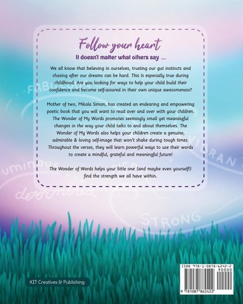 Raise a strong, self-confident & assured child, even if you aren't sure where to start. The Wonder of My Words is your guide to help your child realize their full potential by providing you a delightful story that opens a conversation to how your child is feeling, It also gives powerful positive affirmations for your child to easily add to their constructive self-talk. Self doubt and criticism? We've all experienced it. Nevertheless, why is it that some people are able to push it aside and chase after their dreams while others sit idly by? By age 5, children have already created the level of self-esteem they could carry throughout their lifetime. Supportive actions by both parents and the child themselves - such as encouragement and praise - is important in creating a strong self-esteem foundation. The Wonder of My Words gives parents and children a delightful "guide" in how to start daily positive self-talk and praise, even from a young age. This books gives you the tools you need to create that solid foundation of self-love, purpose, and self-belief necessary for the successful future you hope for your child.The Wonder of My Words helps your child with:Feeling Liked Feeling Confident Being Courageous Believing In Themselves Feeling Proud Understanding Failure Happens to Everyone Becoming a Leader Practicing saying Positive Self Talk Feeling Empowered Exploring New Activities Without Fear of Failure And especially.... Knowing They Are Loved Inspired by the author's own daughters' self-confidence struggles and the need Mikala felt to help promote positivity, The Wonder of My Words book is the perfect book for any child 3-12. Mikala crafted The Wonder of My Words to be inclusive and be the perfect read along for boys, girls, toddlers to early readers and maybe even the adult reading it with them! Parents, grandparents, counselors, and teachers alike love the skill sets the book teachers through empowering kids to explore, build, and love their own unique spirits and find it to be the perfect gift for those special moments. Pick up your copy of Wonder of Words today and start finding the inner strength we all have within!