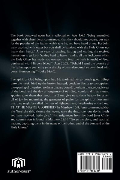 The book bestowed upon her is reflected on Acts 1:4,5 "being assembled together with them, Jesus commanded that they should not depart, but wait for the promise of the Father, which says he, you have heard of me. For John truly baptized with water but you shall be baptized with the Holy Ghost not many days hence." After years of praying, fasting and waiting she received instruction to go forth "taking heed to herself, and to all the flock, over which the Holy Ghost has made you overseers, to feed the flock (church) of God, purchased with His own blood." (Acts 20:28) "Behold I send the promise of my Father upon you: tarry ye in the city of Jerusalem, until ye be endued with power from on high" (Luke 24:49). The Spirit of God being upon her, He anointed her to preach good tidings unto the meek, bind up the broken hearted, proclaim liberty to the captives, the opening of the prison to them that are bound, proclaim the acceptable year of the Lord, and the day of vengeance of our God, comfort all that mourn, appoint unto them that mourn in Zion, give unto them beauty for ashes, oil of joy for mourning, the garments of praise for the spirit of heaviness; that they might be called the trees of righteousness, the planting of the Lord, THAT HE MAY BE GLORIFIED! In Matthew 10:8, Jesus commanded that she "heal the sick, cleanse the lepers, raise the dead, cast out devils: freely you have received, freely give." This assignment from the Lord Jesus Christ and commission is found in Matthew 28:19 "Go ye therefore, and teach all nations, baptizing them in the name of the Father, and of the Son, and of the Holy Ghost:"