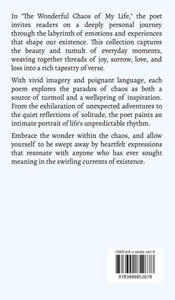 In "The Wonderful Chaos of My Life," the poet invites readers on a deeply personal journey through the labyrinth of emotions and experiences that shape our existence. This collection captures the beauty and tumult of everyday moments, weaving together threads of joy, sorrow, love, and loss into a rich tapestry of verse. With vivid imagery and poignant language, each poem explores the paradox of chaos as both a source of turmoil and a wellspring of inspiration. From the exhilaration of unexpected adventures to the quiet reflections of solitude, the poet paints an intimate portrait of life's unpredictable rhythm. Embrace the wonder within the chaos, and allow yourself to be swept away by heartfelt expressions that resonate with anyone who has ever sought meaning in the swirling currents of existence.