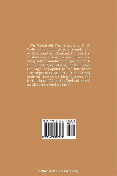 The Wonderful Visit is novel by H. G. Wells with an angel who spends a a week in southern England. He is at first mistaken for a bird because of his dazzling polychromatic plumage, for he is "neither the Angel of religious feeling nor the Angel of popular belief," but rather "the Angel of Italian art.". It has strong satirical themes mocking customs and institutions of Victorian England as well as idealistic rebellion itself.