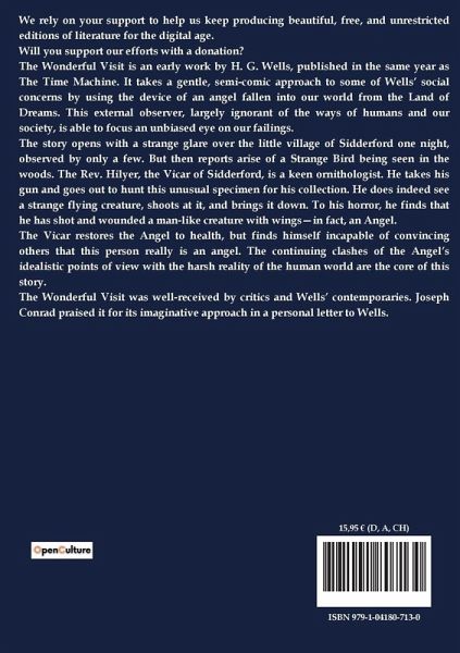 "The Wonderful Visit" by H. G. Wells is a fantastical narrative that explores the unexpected arrival of an angel in a small English village. The story begins with a mysterious glare and sound on Sidderford Moor, witnessed by a few villagers. The Vicar of Siddermorton, an ornithologist, is intrigued by reports of a strange bird and sets out with his gun, only to accidentally shoot an angel. The angel, with iridescent wings and a saffron robe, is bewildered by the earthly realm, perceiving it as a dream. The Vicar, equally perplexed, attempts to rationalize the angel's presence, considering the possibility of multiple dimensions or worlds. As the angel adapts to human customs, he is dressed in the Vicar's clothes, which diminishes his ethereal appearance. The Vicar's household and the local community react with shock and disbelief, particularly the Curate's wife, who is scandalized by the angel's initial attire. The Vicar seeks the help of Doctor Crump, who dismisses the angel as a case of abnormality rather than a celestial being. The narrative delves into themes of perception, reality, and the clash between the mundane and the extraordinary. Wells uses the angel's visit to critique societal norms and the limitations of human understanding, blending humor with philosophical inquiry. The story challenges readers to reconsider the boundaries of reality and the nature of belief, leaving them to ponder the coexistence of the fantastical and the real.