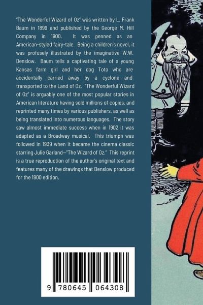 "The Wonderful Wizard of Oz" was written by L. Frank Baum in 1899 and published by the George M. Hill Company in 1900. It was penned as an American-styled fairy-tale. Being a children's novel, it was profusely illustrated by the imaginative W.W. Denslow. Baum tells a captivating tale of a young Kansas farm girl and her dog Toto who are accidentally carried away by a cyclone and transported to the Land of Oz. "The Wonderful Wizard of Oz" is arguably one of the most popular stories in American literature having sold millions of copies, and reprinted many times by various publishers, as well as being translated into numerous languages. The story saw almost immediate success when in 1902 it was adapted as a Broadway musical. This triumph was followed in 1939 when it became the cinema classic starring Julie Garland-"The Wizard of Oz." This reprint is a true reproduction of the author's original text and features many of the drawings that Denslow produced for the 1900 edition.