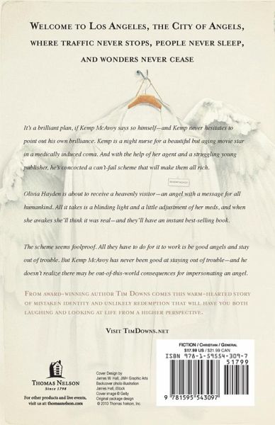 Welcome to Los Angeles, the city of angels, where traffic never stops, people never sleep, and wonders never cease. It's a brilliant plan, if Kemp McAvoy says so himself--and Kemp never hesitates to point out his own brilliance. Kemp is a night nurse for a beautiful but aging movie star in a medically induced coma. And with the help of her agent and a struggling young publisher, he's concocted a can't-fail scheme that will make them all rich. Olivia Hayden is about to receive a heavenly visitor--an angel with a message for all humankind. All it takes is a blinding light and little adjustment of her meds, and when she awakes she'll think it was real--and they'll have an instant best-selling book. The scheme seems foolproof. All they have to do for it to work is be good angels and stay out of trouble. But Kemp McAvoy has never been good at staying out of trouble--and he doesn't realize there may be out-of-this-world consequences for impersonating an angel. From award-winning author Tim Downs comes this warm-hearted story of mistaken identity and unlikely redemption that will have you both laughing and looking at life from a higher perspective.