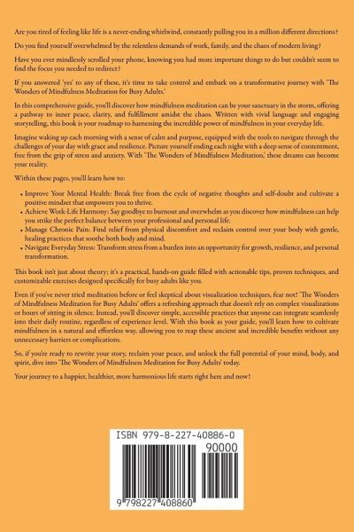 Are you tired of feeling like life is a never-ending whirlwind, constantly pulling you in a million different directions? Do you find yourself overwhelmed by the relentless demands of work, family, and the chaos of modern living? Have you ever mindlessly scrolled your phone, knowing you had more important things to do but couldn't seem to find the focus you needed to redirect? If you answered 'yes' to any of these, it's time to take control and embark on a transformative journey with 'The Wonders of Mindfulness Meditation for Busy Adults.' In this comprehensive guide, you'll discover how mindfulness meditation can be your sanctuary in the storm, offering a pathway to inner peace, clarity, and fulfillment amidst the chaos. Written with vivid language and engaging storytelling, this book is your roadmap to harnessing the incredible power of mindfulness in your everyday life. Imagine waking up each morning with a sense of calm and purpose, equipped with the tools to navigate through the challenges of your day with grace and resilience. Picture yourself ending each night with a deep sense of contentment, free from the grip of stress and anxiety. With 'The Wonders of Mindfulness Meditation, ' these dreams can become your reality. Within these pages, you'll learn how to: * Improve Your Mental Health: Break free from the cycle of negative thoughts and self-doubt and cultivate a positive mindset that empowers you to thrive. * Achieve Work-Life Harmony: Say goodbye to burnout and overwhelm as you discover how mindfulness can help you strike the perfect balance between your professional and personal life. * Manage Chronic Pain: Find relief from physical discomfort and reclaim control over your body with gentle, healing practices that soothe both body and mind. * Navigate Everyday Stress: Transform stress from a burden into an opportunity for growth, resilience, and personal transformation. This book isn't just about theory; it's a practical, hands-on guide filled with actionable tips, proven techniques, and customizable exercises designed specifically for busy adults like you. Even if you've never tried meditation before or feel skeptical about visualization techniques, fear not! 'The Wonders of Mindfulness Meditation for Busy Adults' offers a refreshing approach that doesn't rely on complex visualizations or hours of sitting in silence. Instead, you'll discover simple, accessible practices that anyone can integrate seamlessly into their daily routine, regardless of experience level. With this book as your guide, you'll learn how to cultivate mindfulness in a natural and effortless way, allowing you to reap these ancient and incredible benefits without any unnecessary barriers or complications. So, if you're ready to rewrite your story, reclaim your peace, and unlock the full potential of your mind, body, and spirit, dive into 'The Wonders of Mindfulness Meditation for Busy Adults' today. Your journey to a happier, healthier, more harmonious life starts right here and now!