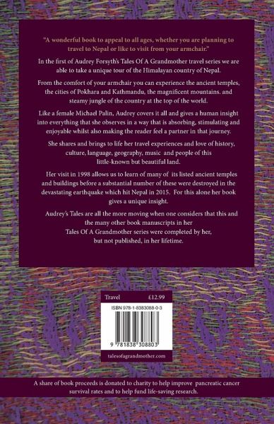 In the first of Audrey Forsyth's Tales Of A Grandmother travel series we are able to take a unique tour of the Himalayan country of Nepal. From the comfort of your armchair you can experience the ancient temples, the cities of Pokhara and Kathmandu, the magnificent mountains. and steamy jungle of the country at the top of the world. Like a female Michael Palin, Audrey covers it all and gives a human insight into everything that she observes in a way that is absorbing, stimulating and enjoyable whilst also making the reader feel a partner in that journey. She shares and brings to life her travel experiences and love of history, culture, language, geography, music and people of this little-known but beautiful land. Her visit in 1998 allows us to learn of many of its listed ancient temples and buildings before a substantial number of these were destroyed in the devastating earthquake which hit Nepal in 2015. For this alone her book gives a unique insight. Audrey's Tales are all the more moving when one considers that this and the many other book manuscripts in her Tales Of A Grandmother series were completed by her, but not published, in her lifetime.