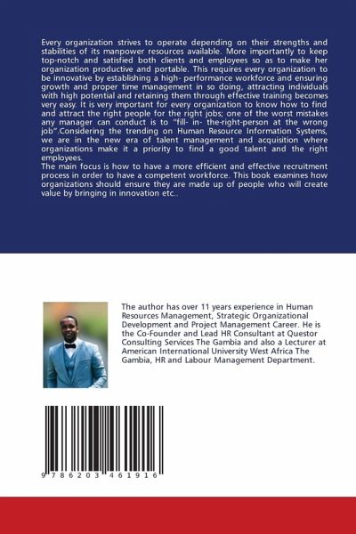 Every organization strives to operate depending on their strengths and stabilities of its manpower resources available. More importantly to keep top-notch and satisfied both clients and employees so as to make her organization productive and portable. This requires every organization to be innovative by establishing a high- performance workforce and ensuring growth and proper time management in so doing, attracting individuals with high potential and retaining them through effective training becomes very easy. It is very important for every organization to know how to find and attract the right people for the right jobs; one of the worst mistakes any manager can conduct is to "fill- in- the-right-person at the wrong job".Considering the trending on Human Resource Information Systems, we are in the new era of talent management and acquisition where organizations make it a priority to find a good talent and the right employees. The main focus is how to have a more efficient and effective recruitment process in order to have a competent workforce. This book examines how organizations should ensure they are made up of people who will create value by bringing in innovation etc..