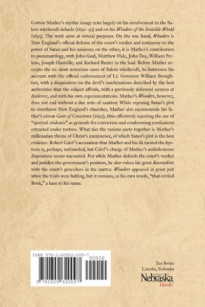 Cotton Mather's mythic image rests on his involvement in the Salem witchcraft debacle (1692-93) and on his Wonders of the Invisible World (1693)-an official defense of the court's verdict and a testimony to the power of Satan and his minions. Mather excerpts the six most notorious cases of Salem witchcraft and buttresses his account with the official endorsement of Lt. Governor William Stoughton, with a disquisition on the devil's machinations described by the best authorities that the subject affords, with a previously delivered sermon at Andover, and with his own experimentations. What ties the various parts together is Mather's millenarian theme of Christ's imminence, of which Satan's plot is the best evidence. Though Mather defends the court's verdict and justifies the government's position, he also voices his great discomfort with the court's procedure in the matter. Wonders appeared in print just when the trials were halting, but it remains, in his own words, "that reviled Book," a bane to his name.