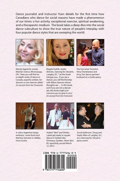 Dance instructor and journalist John Yuen details for the first time how Canadians who dance for social reasons have made a phenomenon of our times: a fun activity, exceptional exercise, spiritual awakening, and a therapeutic medium. The Wondrous World of Social Dancing in Canada: Come Dance Ballroom, Salsa, Square-Dance and Argentine Tango with Me! takes a deep dive into the social dance subculture to show the true nature of Canadians' interplay with four popular dance styles that are sweeping the world. The book is an easy read containing chapters on the history of social dancing in Canada. As a starter. it pulls back the curtain to trace the beginning of social dancing from 1605 when the first colony of New France was established by the French, and subsequently by the British and other European settlers. It is made clear that social dancing actually began centuries earlier with the Indigenous people. Good descriptions of why Indigenous peoples danced (and still do) for reasons beyond "social". The first chapter explains how they dance historically for religious and ceremonial reasons as well. On the other hand, readers will learn that the successive waves of colonists danced socially--to forget how they have to toil to survive the wilderness that has been Canada for many, many generations. The chapter concludes with the effects on dancers and dance schools with the beginning of the COVID-19 pandemic. The second chapter covers the emotional and physical reactions of dancers as participants in ballroom/Latin; salsa, square-dancing and Argentine tango. They tell stories about how and why they started dancing; their perception of the ways their teachers instruct; their "best practices" in practicing their steps outside the classroom; and what were the best experiences they have had on the social dance floor. Chapter three examines the role of dancing by persons with Parkinson's disease (PD) in relieving their physical symptoms and reducing physical isolation. Several interest groups such as the National Ballet of Canada have stepped up to the plate to help. Partnering with one another, the groups have particularly focused on Argentine tango as the main delivery mechanism to help persons with PD. There is a section that features two Nova Scotian couples who have enjoyed a certain degree of success in curbing the discomforts associated with PD. The last chapter offers a detailed look at the social dancing industry: the background of studio and club owners and their instructors in the four dance genres. A notable aspect of the dance academies is that the instructors reflect the diversity of the Canadian multi-cultural population. Competitive dancing which is a representation of social dancing receives kudos from Canadians across the country in a special column called "39 Opinions." For example, a male social dancer from Nova Scotia wrote ""I've enjoyed seeing amateur dancers of limited skill improve in their ability, often to a level that looks quite polished. Such improvements are usually the result of determination, coaching and practice." One female dancer in Ontario, Canada's most populous province, remarked: "I love watching it. It's a combination of things. So, it's beautiful in terms of the mood and their bodies, especially some of the Latin stuff. Just phenomenal. I love the costumes, the theatricality of it."
