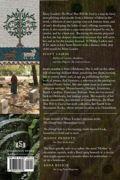 "Mary Leader's The Wood That Will Be Used is a tour de force exemplifying what results from a lifetime of labor in the word, a lifetime of one's poring over rich literary texts, and of one's developing the habit of one's offering answering texts; it also manifests a capacious mind shaped by wit, by candor, and by a keen eye. Receiving the matter prepared for her, she has shaped a beautiful structure that will serve her and us for the journey beyond. If Philip Larkin and H.D. were to have been blessed with a literary child, that child would be Mary Leader." -Scott Cairns From reviews of Mary Leader's previous work, The Distaff Side (Shearsman Books, 2022): "The Distaff Side is a fascinating, multi-layered book, beautiful to hold and to read." -Mandy Pannett, for Tears in the Fence "The final spindle ends in a cipher: the word 'Mother' in decorative capitals, with a floral sprig beneath it: a device that might appear on a transfer sheet for embroidery - or on a headstone." -Anna Reckin