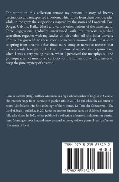 The stories in this collection retrace my personal history of literary fascinations and unexpressed emotions, which arose from them over decades, while in me grew the suggestions inspired by the stories of Lovecraft, Poe, Borges, Calvino, Kafka, Musil and various other authors of the same strand. These suggestions gradually intertwined with my interests regarding surrealism, together with my studies on fairy tales. All this inner universe of mine has given life to these stories, sometimes minimal flashes that seem to spring from dreams, other times more complex narrative textures that unconsciously brought me back to the sense of wonder that captured me when I was a very young reader, when I perceived the metaphysical and grotesque spirit of unresolved curiosity for the human soul while it strives to grasp the pure mystery of creation.