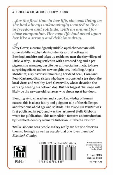 ...for the first time in her life, she was living as she had always unknowingly wanted to live: in freedom and solitude, with an animal for close companion. Her new life had acted upon her like a strong and delicious drug. Ivy Gover, a curmudgeonly middle-aged charwoman with some slightly witchy talents, inherits a rural cottage in Buckinghamshire and takes up residence near the tiny village of Little Warby. Having settled in with a rescued dog and a pet pigeon, she manages, despite her anti-social instincts, to have surprising effects on her new neighbours, including Angela Mordaunt, a spinster still mourning her dead beau, Coral and Pearl Cartaret, ditzy sisters who have just opened a tea shop, the local vicar, and wealthy Lord Gowerville, whose devotion she earns by healing his beloved dog. But her biggest challenge will likely be the 12-year-old runaway who shows up at her door... Blending vivid characters and a deep knowledge of human nature, this is also a funny and poignant tale of the challenges and freedoms of old age and solitude. The Woods in Winter was first published in 1970 and was the last novel Stella Gibbons wrote for publication. This new edition features an introduction by twentieth-century women's historian Elizabeth Crawford. 'Stella Gibbons sees people as they really are but she observes them so lovingly as well as acutely that one loves them too' Elizabeth Goudge